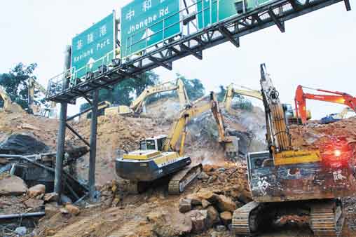 上午,挖土機爬到最頂端清除土方。圖片來源:臺灣《聯合晚報》