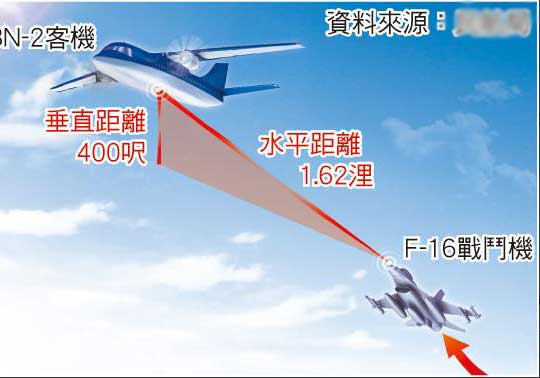 臺軍一架F-16上月與臺灣大鵬航空小客機隔離不足,最近時垂直距離僅400呎、水平距離1.62浬(以戰(zhàn)機航速推估僅需30秒),有潛在碰撞風(fēng)險。圖片來源:臺灣《蘋果日報》