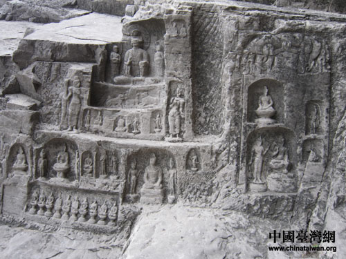 一小塊石壁上雕滿了高不盈寸的佛像,不由讓人驚嘆古代工匠精湛的技藝。(中國臺灣網(wǎng) 朱毅 攝)