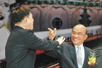 彰化縣同鄉(xiāng)會總會會長交接儀式29日上午在臺北縣政府會議室舉行,兩位臺北市長參選人郝龍斌(左)與蘇貞昌(右)意外同臺,兩人握手后,蘇貞昌伸手向郝龍斌比了一個手勢。(圖片來源:臺灣《聯(lián)合晚報》)