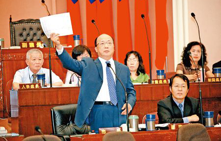 臺(tái)中市日前發(fā)生槍擊案竟有員警在場(chǎng),市長(zhǎng)胡志強(qiáng)“消息不靈”,昨日在議會(huì)現(xiàn)場(chǎng)高舉報(bào)告說(shuō)“我今天才拿到。”圖片來(lái)源:臺(tái)灣《中國(guó)時(shí)報(bào)》