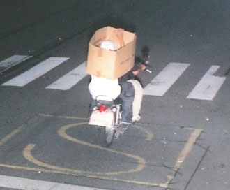 摩托車后座年輕人的上半身以紙箱套住,以為這樣就能躲避查緝。 來源:臺灣《聯合報》