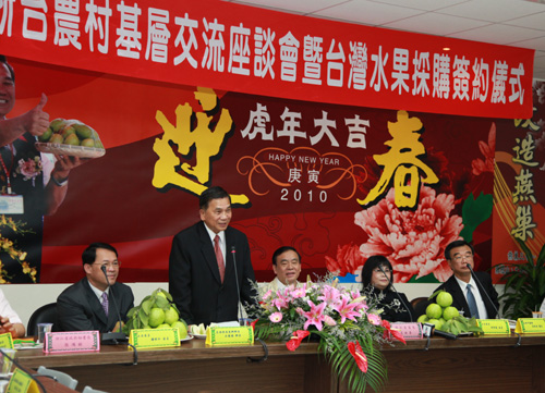 座談會上,浙江省天臺縣石梁鎮石梁村等5個村的村長與高雄縣的5個村結為友好村坊,建立了長效交流對接機制。浙江省從高雄農戶手中現場采購鳳梨5000箱、香蕉2600箱、芭樂1600箱、芒果1800箱,并簽訂了總價值人民幣1500萬元的農產品采購合同。