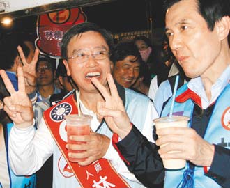 2010年2月,國民黨主席馬英九(右)陪同國民黨籍“立委”補選候選人林德瑞(左)掃街拜票。資料圖