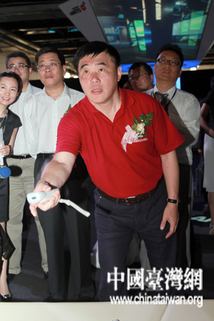 6月17日,臺北市長郝龍斌在“2010上海、臺北雙城文化創意產業博覽會”上體驗互動家庭娛樂系統。(中國臺灣網 田云鵬 攝)