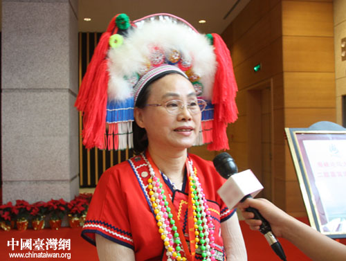 阿美族代表林靜玉在海峽論壇場外接受采訪。(中國臺灣網 徐麗華 攝)