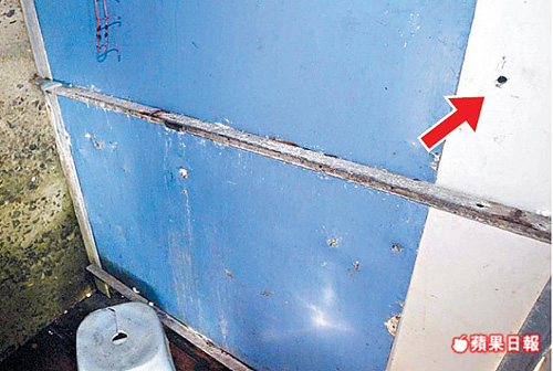 林身茂躲在更衣室,利用隔間墻上小洞(箭頭處)偷窺。