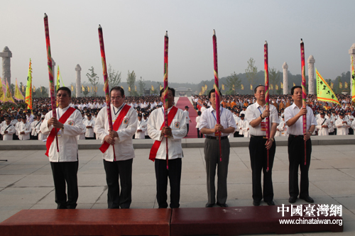 兩岸主祭人國臺(tái)辦交流局局長李維一、臺(tái)灣“中華神農(nóng)大帝協(xié)進(jìn)會(huì)”理事長陳福財(cái)?shù)裙簿锤呦悖ㄖ袊_(tái)灣網(wǎng) 趙輝 攝)