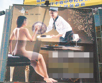 宜蘭市一家餐廳用裸女照廣告,雖然很吸晴,但是在民風保守的宜蘭引起議論,廣告中的裸女是名護專生。 圖片來源:臺灣《聯合報》