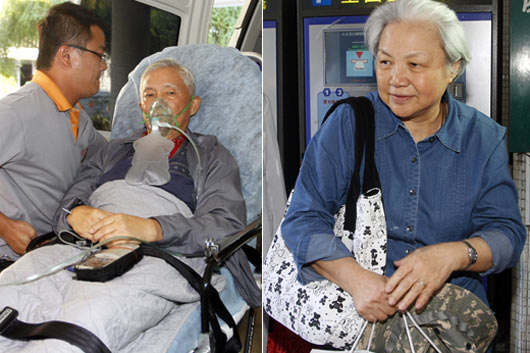 唐飛(左)驚傳肺炎引發敗血癥,家屬昨晚緊急租用包機將唐飛從大連接回,直接送榮總醫院救治。唐飛夫人張明燦(右)證實唐飛是肺炎。圖片來源:臺灣《聯合報》