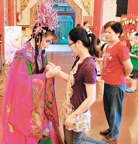 16日是農歷七夕、中國傳統的情人節,傳說這天是七夕娘娘的誕辰,在臺灣叫“七娘媽”,除了掌管人世間姻緣路外,更會照顧出生小孩平安長大。慈鳳宮昨天找人扮演七夕娘娘,在小提琴、薩克斯風幽揚樂聲伴奏下,為祈求姻緣的男女信眾戴上五色珠的紅絲線,希望求得好姻緣、夫妻幸福、小兒平安。