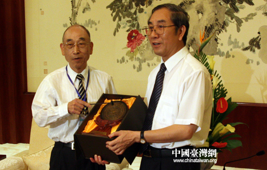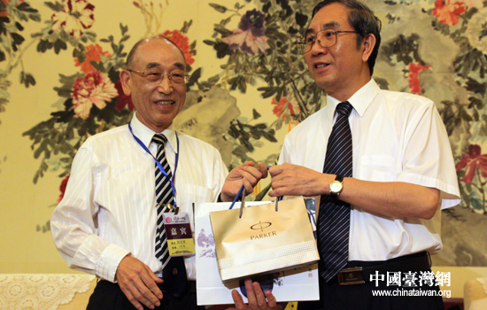 隨后,馬飚將一面具有濃郁廣西民族特色的樂(lè)器“銅鼓”贈(zèng)予臺(tái)灣嘉賓,張京育則以臺(tái)灣高山茶回贈(zèng)。(記者 張弛)