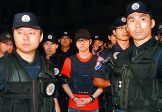臺中市警局昨晚把槍殺翁奇楠的主嫌廖國豪(中穿紅衣防彈背心者),移送少年法庭收容。(圖片來源:臺灣《聯(lián)合報》)