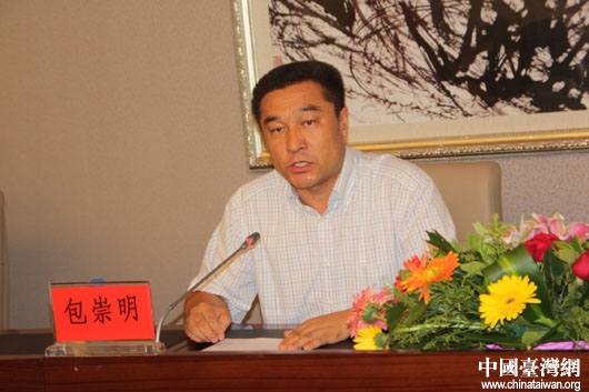 鄂爾多斯市副市長包崇明向全國知名網絡媒體記者介紹鄂爾多斯經濟社會發展情況。(中國臺灣網 王文英 攝)