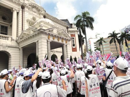臺中市府廣場涌入?yún)⑦x人大批支持者,形成旗海飄揚的熱鬧場面。來源:臺灣《中國時報》