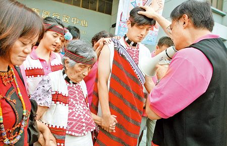 在臺北市選委會外,有臺灣少數(shù)民族市議員參選人身著傳統(tǒng)服裝,在耆老與族人的陪同下前往登記。來源:臺灣《中國時報》