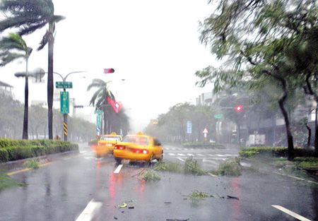 被凡亞比臺風吹斷的路樹橫在路中,汽車以S型行駛閃避,險象環生。來源:臺灣《中國時報》