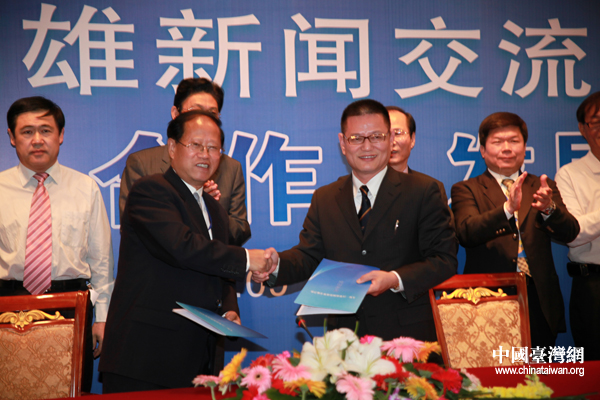 太原市新聞工作者協會主席黃征與高雄市新聞記者公會理事長馬道明共同簽署“四點共識”。 (中國臺灣網 田云鵬 攝)