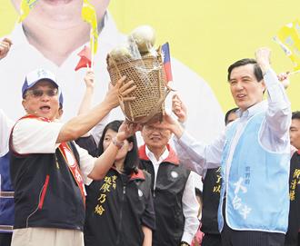 馬英九(右)把一簍“金雞蛋”送給胡志強(qiáng)(左),象征臺中市經(jīng)濟(jì)起飛。來源:臺灣《聯(lián)合報》