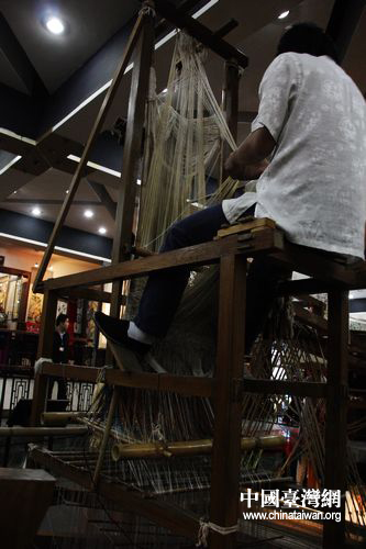 拽花工提起下方的絲線,每次選取不同的絲線將決定蜀錦的圖案。(中國臺灣網(wǎng) 馬迪 攝)
