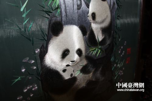 蜀江錦院中也陳列眾多蜀繡精品。圖為大小熊貓坐屏,繡工精美,纖毫畢現(xiàn)。(中國臺灣網(wǎng) 馬迪 攝)