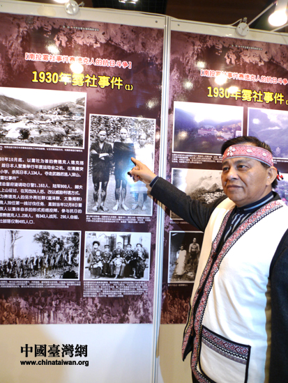 很多事件親歷者的后人也是第一次看到這些照片。本次臺灣少數民族抗日后裔頭目長老參訪團團長林添喜(莫那·一亨)在“霧社事件”的展板前指著自己祖父的照片,他的祖父是這次事件的領導者,對日本侵略者進行過艱苦的抵抗。林添喜激動地說:“這也是我祖父生前唯一的照片。塞德克人的字典里,沒有投降兩個字,面對敵人,要不戰(zhàn)死,要不自縊。”