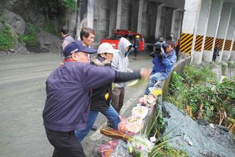 創(chuàng)意旅行社司機(jī)郭銘麟及導(dǎo)游曾慶華的家屬,昨天帶著冥紙及鮮花到112.8公里處祭拜。(圖:臺灣《聯(lián)合報》)