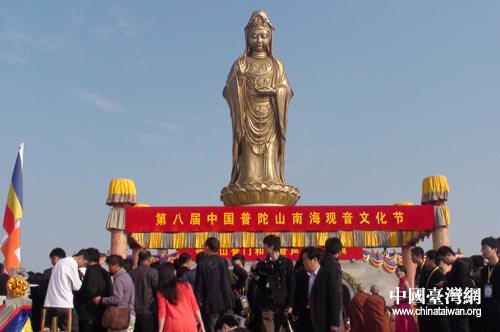 中國臺灣網11月5日舟山消息 今天上午,第八屆中國南海觀音文化節(jié)在浙江普陀山南海觀音大佛廣場隆重開幕。臺灣南鯤鯓代天府和臺灣靈鷲山等佛教交流團共200余人應邀參加文化節(jié)。