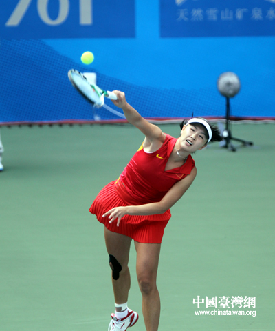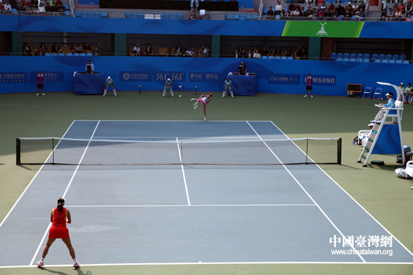 中國臺灣網11月16日廣州消息 第十六屆廣州亞運會女子網球團體賽決賽正在進行,中國隊同中華臺北隊展開金牌爭奪戰,中國隊選手彭帥對陣中華臺北隊選手張凱貞,奉獻第一場單打。(記者 鐘寶華)