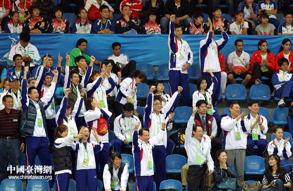 中華臺(tái)北跆拳道隊(duì)隊(duì)員、教練員為黃顯詠助威(中國臺(tái)灣網(wǎng) 鐘寶華 攝)
