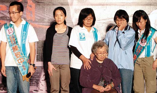 角逐高雄市議員的陳致中(左),昨晚舉辦一場阿扁坐牢惜別晚會,扁媽陳李慎(右三)、扁姐,還有陳幸妤(左二)都來到會場。(記者劉學圣/攝影 圖片來源:臺灣《聯合報》)