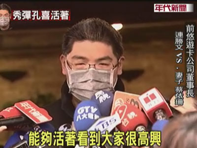 據報道,連勝文終于公開露面,今日上午10時13分他在妻子蔡依珊的陪同下步出住處,僅說了一句話:“謝謝大家關心,能夠活著看到大家,很高興,謝謝大家。”隨后便搭上座車,前往臺大醫院,未再多發表談話。