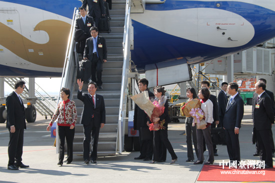 20日中午,由海協會會長陳云林率領的海協會協商代表團乘坐國航CA185次航班順利抵達臺北桃園機場,參加將于21日上午舉行的兩會領導人第六次會談!。ㄖ袊_灣網 鐘寶華 攝)