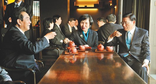 海協(xié)會會長陳云林(左)20日下午在臺灣海基會董事長江丙坤(右)陪同下參觀臺北故宮,兩人參觀后一起喝茶并閑話家常。臺北故宮院長周功鑫(中)陪同。 來源:臺灣《聯(lián)合報》