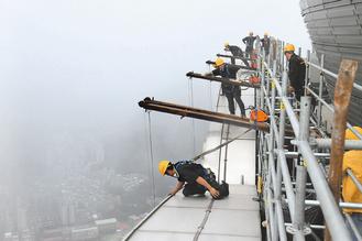焰火設計師在高空勘察作業。圖片來源:臺灣《聯合報》
