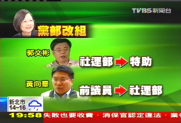 報道稱,此次人事改組,民進黨原政策會執行長劉建忻升任民進黨第3副秘書長;原青年部主任黃重諺接手政策會;而原社運部主任郭文彬,將轉任特助,遺缺延攬卸任議員黃向群。此次改組名單比較敏感的是黃向群,他過去親蘇色彩鮮明,如果蔡英文真的投入2012“大選”初選,將極可能和蘇貞昌形成競爭關系,兩大陣營現在已經開始搶人挖角,蘇蔡2012出線大戰浮上臺面,正式拉開序幕。