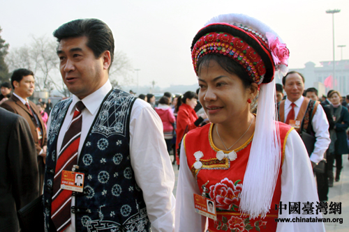 3月5日,十一屆全國人大四次會議在北京人民大會堂開幕。身穿民族服飾的大代表走入會場,成為兩會一道亮麗的風景。(中國臺灣網 董潔 攝)