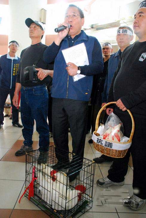 有抗議民眾提著鐵籠,內裝2只白雞,曾順良同他們一同到廟里斬雞頭發誓抗爭。圖片來源:臺灣媒體