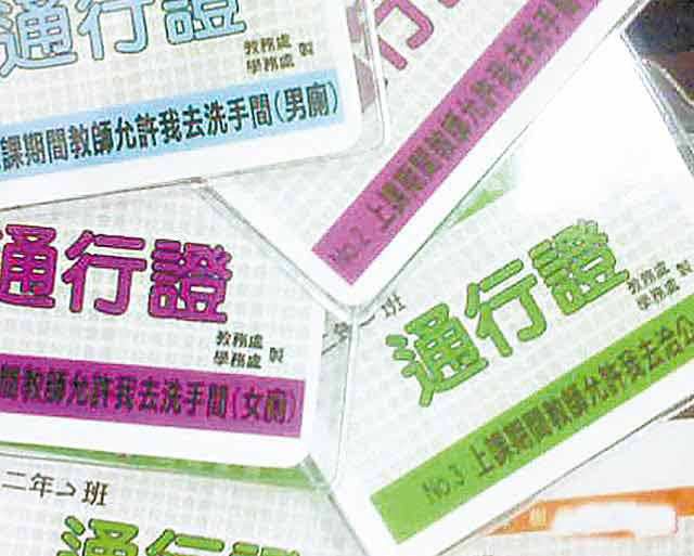 據報道,樹德家商校方本周起要求學生上課時間外出,須經授課老師同意,胸前掛牌外出,通行證上標示“上課期間教師允許我去洗手間”、“上課期間教師允許我去洽公”等,男女顏色也不相同。