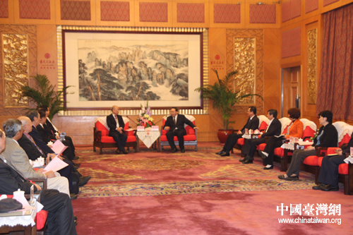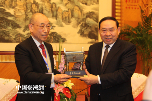 湖南省委副書記梅克保(左)4月2日在長沙會見了以張京育(右)為理事長的中華湖湘文化發展協會一行。(中國臺灣網 楊麗 攝)
