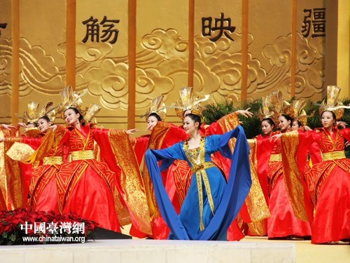 樂舞敬拜環節,舞者金色高冠、大紅色鑲金邊的華服古色古香。(中國臺灣網 馬迪 攝)