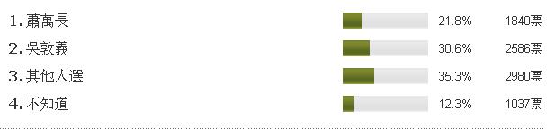 臺(tái)灣Yahoo!奇摩網(wǎng)在馬英九2012副手民調(diào)選項(xiàng)中設(shè)置4個(gè)選項(xiàng)。一是支持蕭萬長;一是支持吳敦義;一是其他人選;一是不知道。經(jīng)過8443人的投票,結(jié)果于今日出爐。