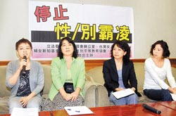 人之初 別亂扯▲婦女團體15日在民進黨立委黃淑英(左二)陪同下舉行記者會,呼吁施明德向臺灣單身女性、同志及女性政治人物道歉。圖片來源:臺灣《中國時報》