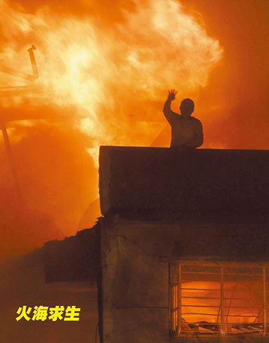 一名男子受困頂樓,顧不得濃煙嗆人,向警消揮手求救。圖片來自網(wǎng)絡(luò)