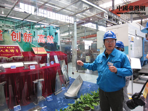 東汽黨委宣傳部副部長孫巖松向網(wǎng)媒記者展示東汽自主創(chuàng)新產(chǎn)品。(中國臺灣網(wǎng) 朱毅 攝)