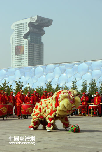第二屆“北京奧林匹克公園美食廣場”28日在京開幕。圖為開幕式現場的舞獅表演。(中國臺灣網 邢同林 攝)