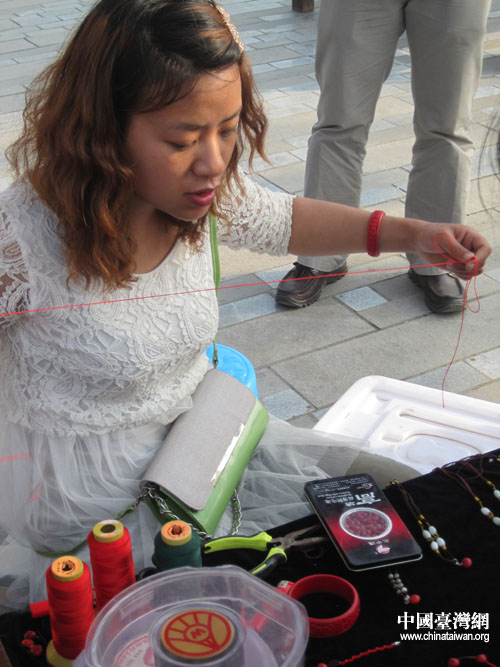 女村民正在為游客制作紅豆手鏈。(中國(guó)臺(tái)灣網(wǎng) 朱毅 攝)