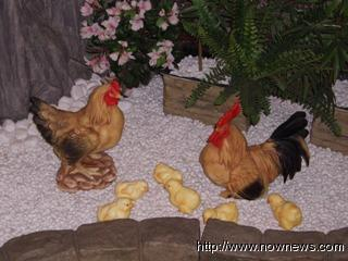 蔡英文昨日拜會呂秀蓮,呂從昔日的嚴厲批評轉為極盡吹捧。呂指著她辦公室大門處的一對帶著小雞的公雞和母雞稱,母雞看起來比公雞還要“雄糾糾、氣昂昂”,這“寓涵天機”。圖片來源:臺灣“今日新聞網”