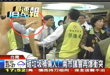 據(jù)報道,臺南市議會今天審查市府總預(yù)算,民進黨總召曾王雅云跟其它黨團議員因?qū)彶榉绞接袪幾h,發(fā)生激烈口角。未料無黨籍議員曾順良順手丟出一只垃圾桶,砸傷了曾王雅云。這突如其來的動作讓大家先是一怔,而后民進黨議員極大不滿,紛紛狂喊“你給我出來”,欲對曾順良群毆為總召“報仇”。曾王雅云對同黨議員進行喝止,這場沖突才沒有升級。