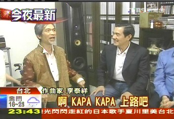 馬英九昨晚探視時,不但送上慰問金,得知作曲用的計算機經(jīng)常死機時,也一并幫忙解決,讓久未開口唱歌大師很感動,立刻用歌聲回報。“一條日光的大道,我奔走大道上,啊,KAPA KAPA,上路吧,這雨季不再來。(歌曲《一條日光的大道》)”